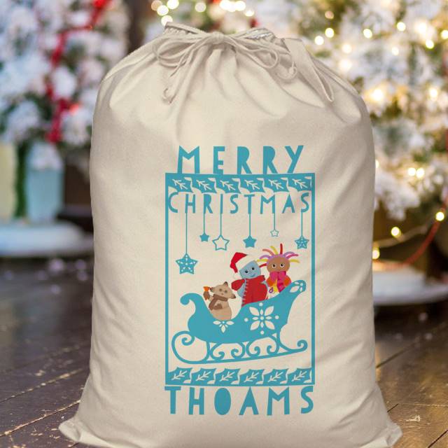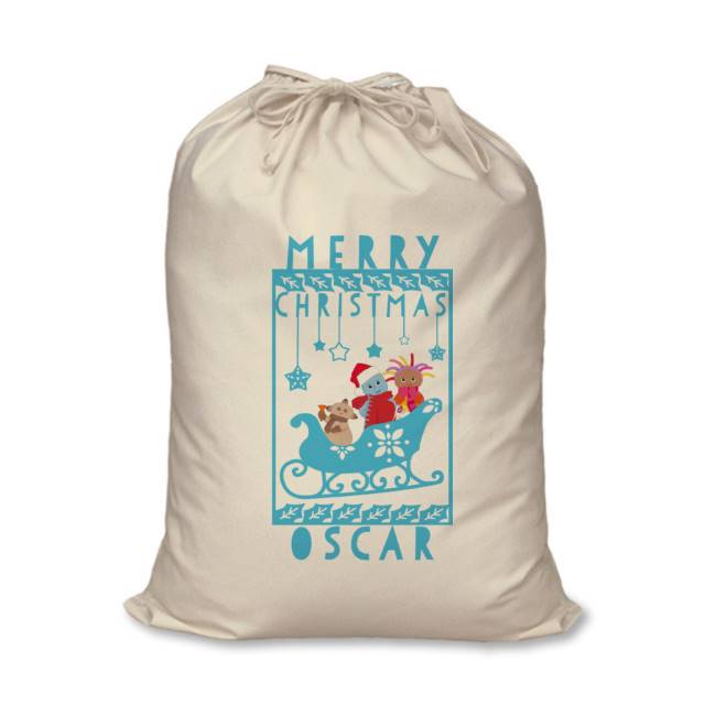 In The Night Garden Snowtime Sleigh themed Sack with Blue Pictures And Text, Personalise With A Name Under The Sleigh
