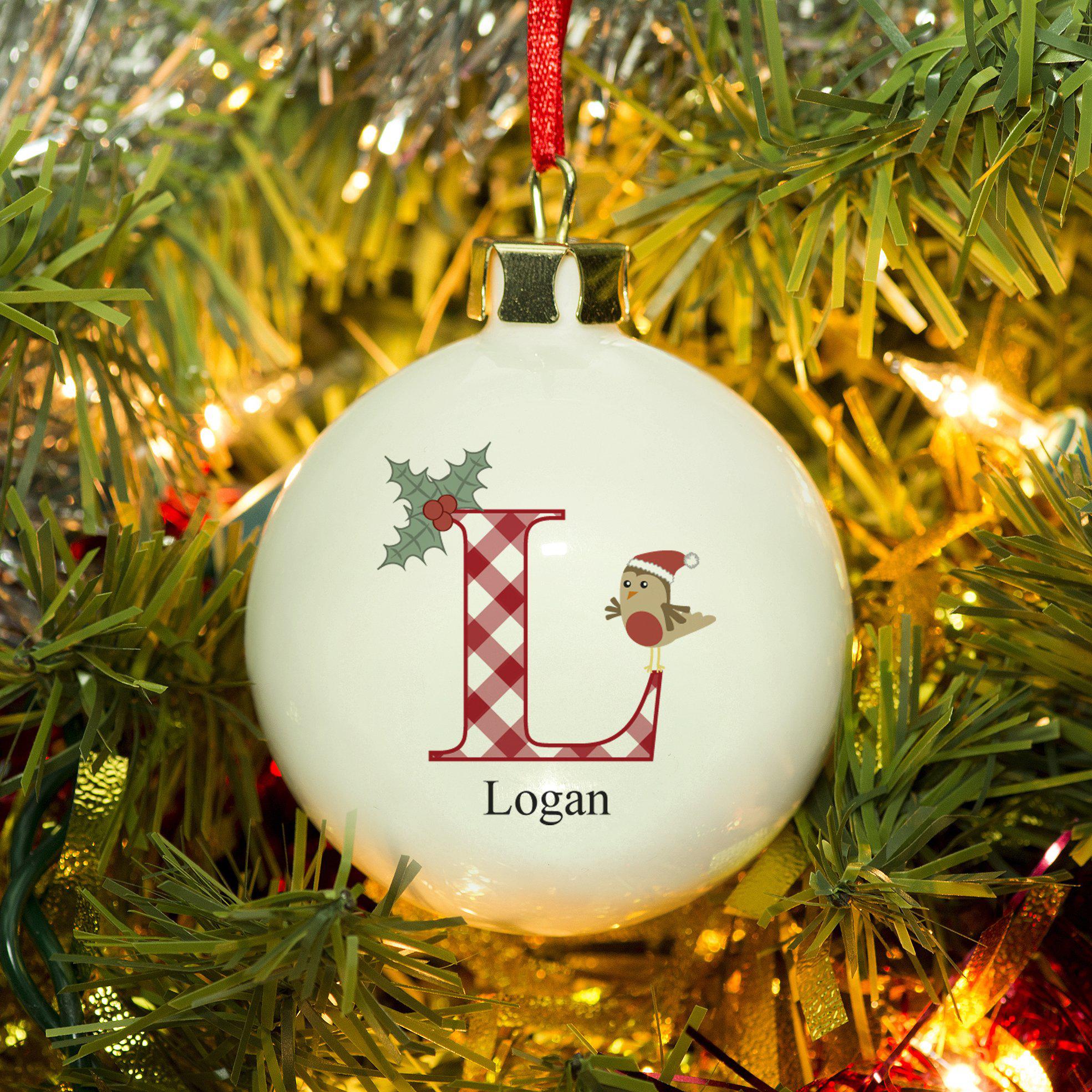 Little Robin Bauble With A Big Initial Featuring A Robin And Holy With A Personalised Name Under The Initial L