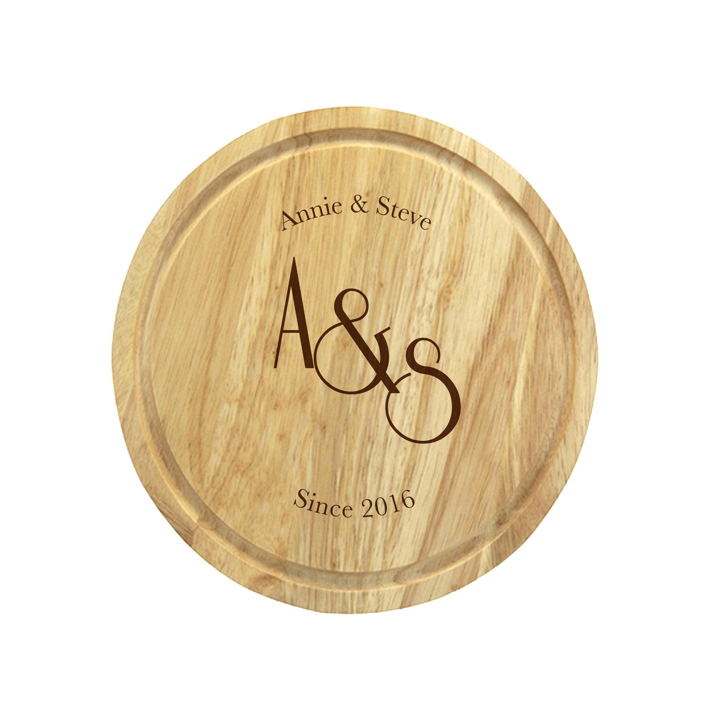 Monogram Wooden Round Cheese Board - 2 Name Positioned At The Top With The Monogram Centered With A Significant Date At The Bottom