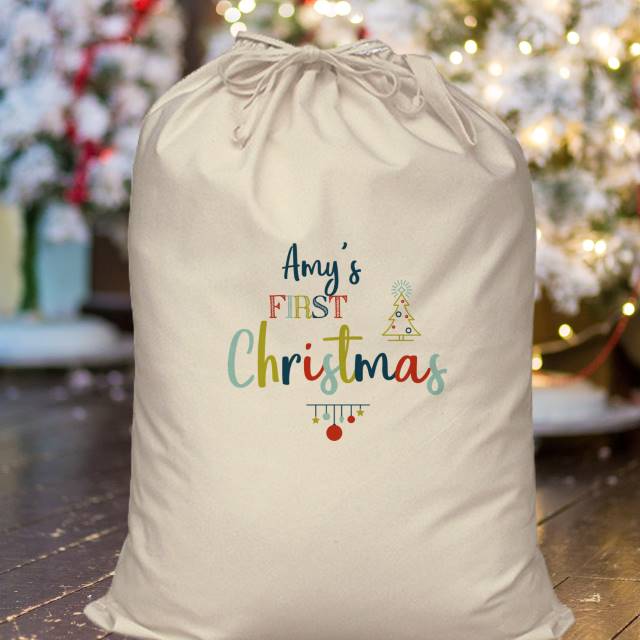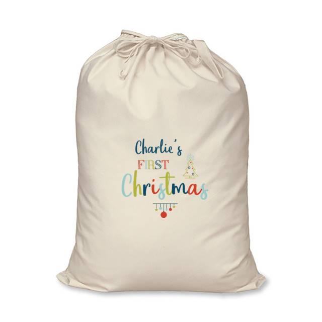 A baby's first Christmas is definitely a landmark to be celebrated. The magic of their first Christmas can always be treasured with this adorable colourful sack. Personalise with a name of 15 characters. This 170gsm cotton sack is 46 cm wide and 60 cm tall. Please note: 'First Christmas' is fixed text.