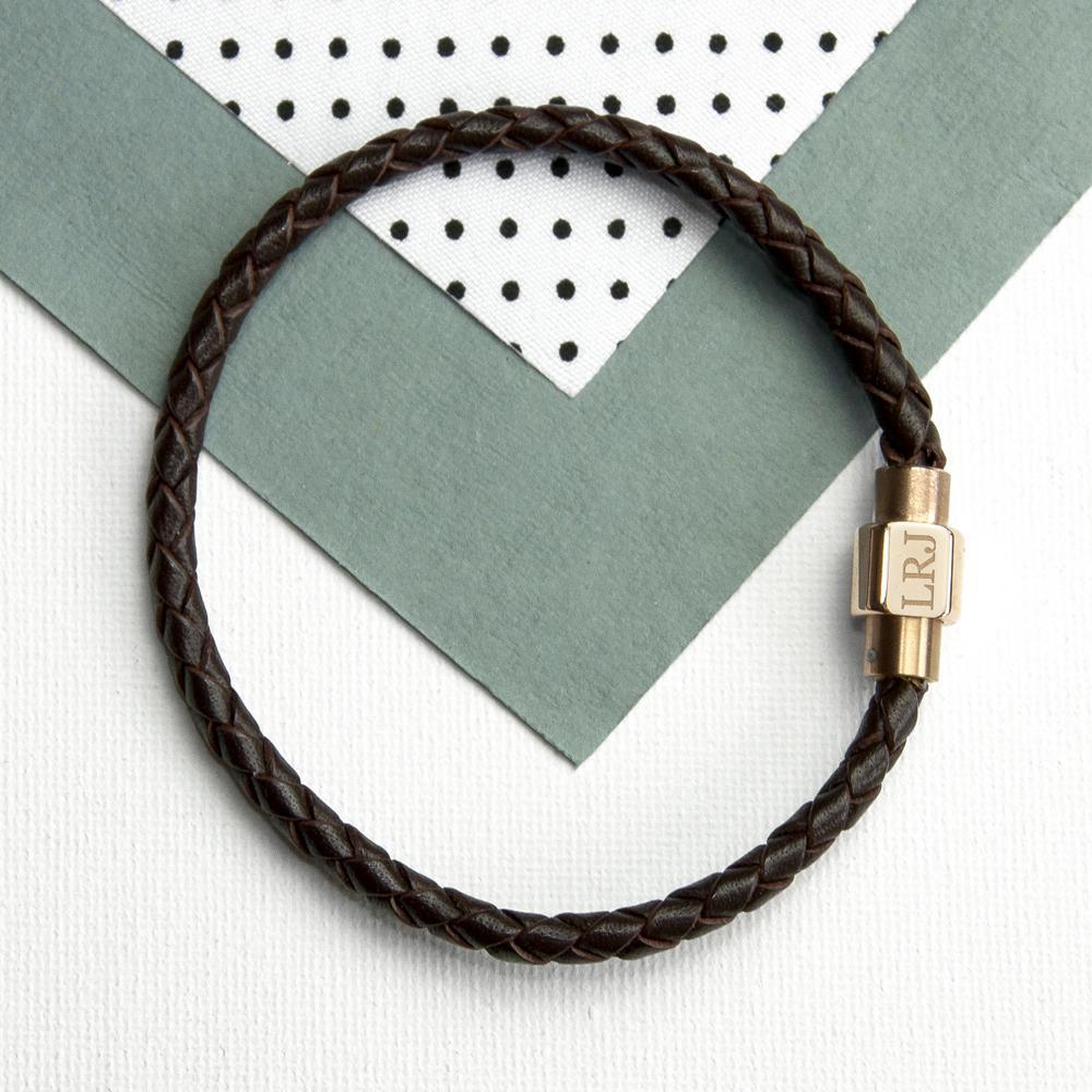 A thoughtful men's leather bracelet with gold clasp will be a welcomed gift for any loved one or friend, engraved with up to three initials. The bracelet is made from treated, hard-wearing woven leather and has a distinctive magnetic clasp for added security as well being easy to wear.