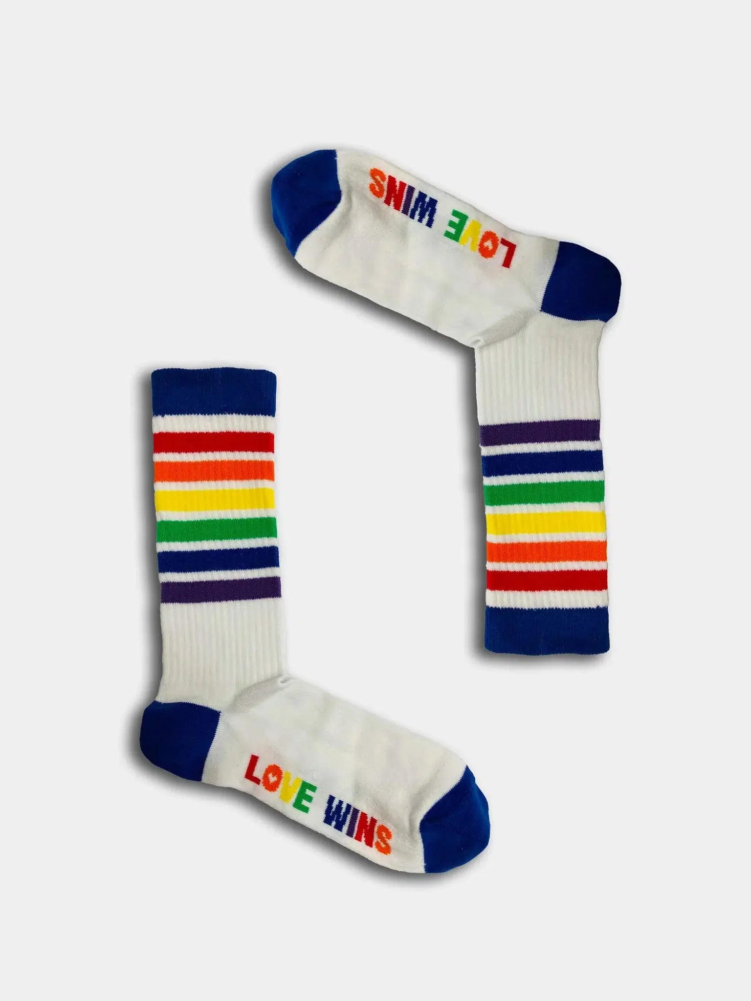 White rainbow socks with text on the sole that reads