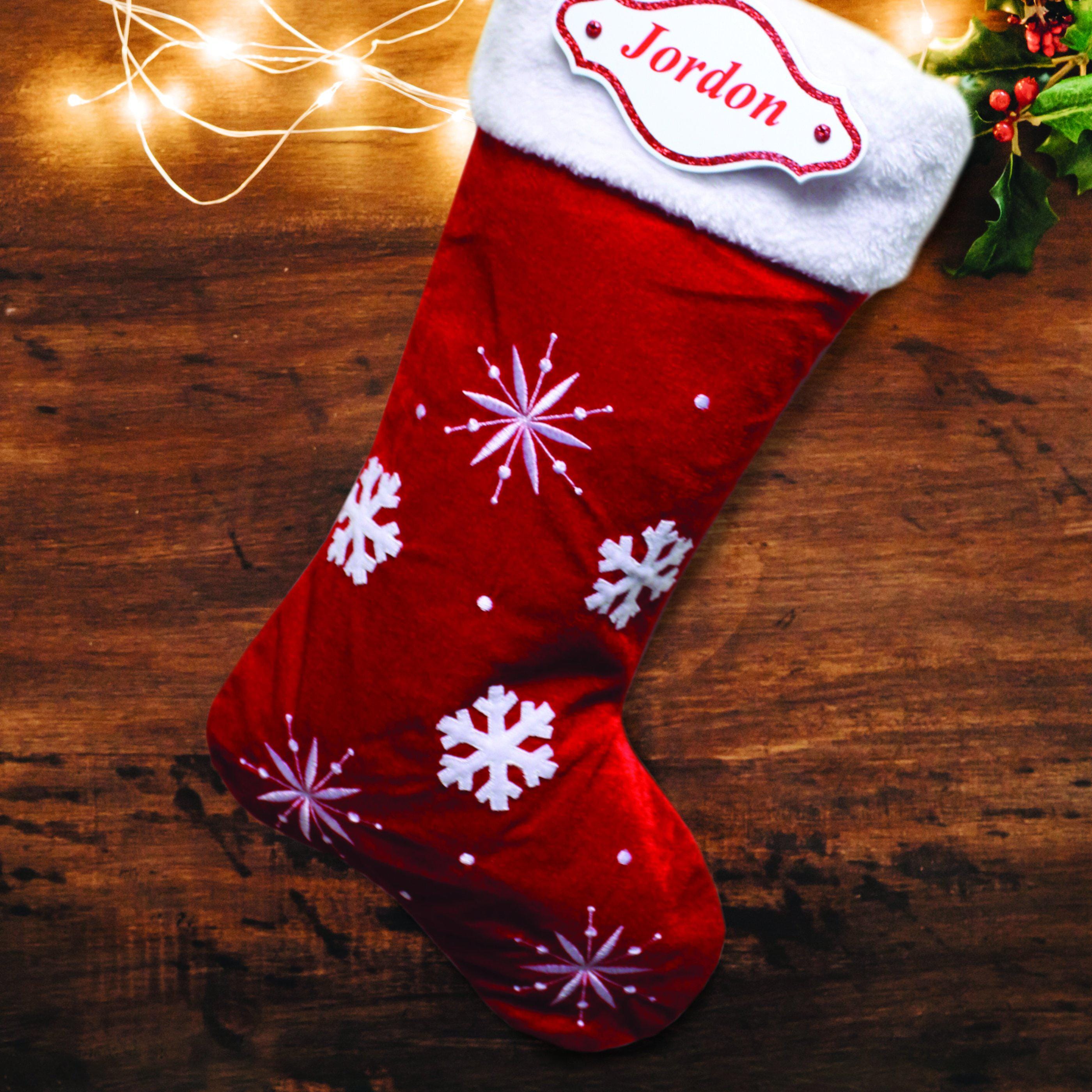 Christmas Stocking Red Snowflake Stocking with Personalised Plaque