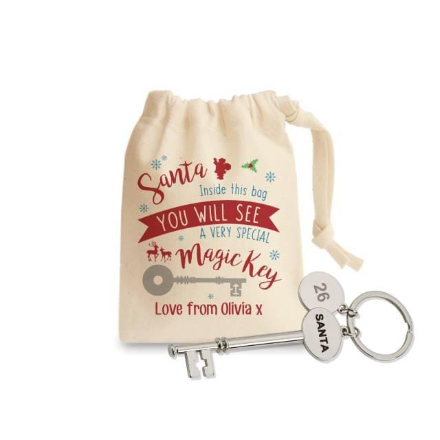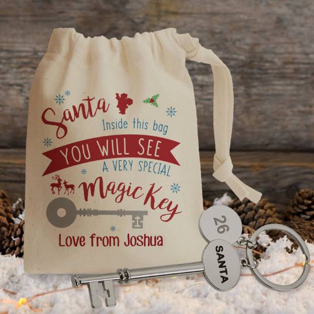 Not got a chimney! Welcome Santa into your home with a Santa's skeleton key, Santa can simply use the front door! Personalise the silver 2x2cm tab with your house number and add either your family name or child's name to the 10x13 cm cotton drawstring bag. The nickel plated zinc alloy key comes in red presentation box inside the bag and the key itself is 8.5cm.