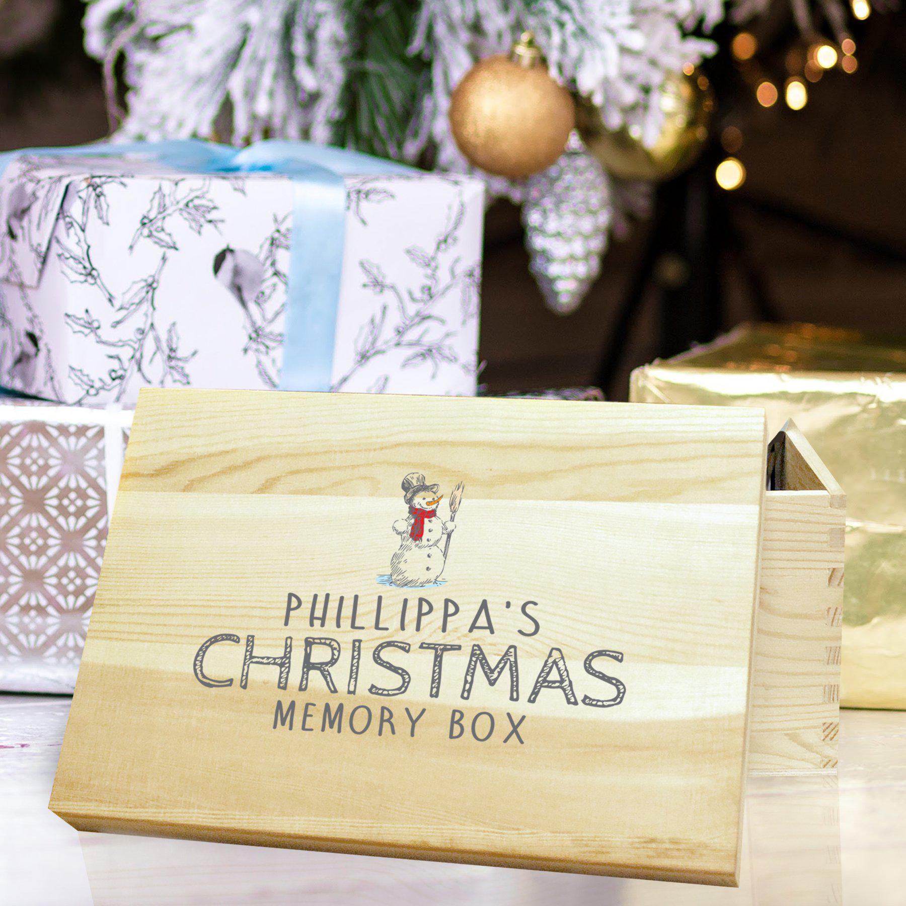 Cute Snowman wooden memento Christmas box, personalise with a name of up to 15 characters above the fixed text 'Christmas Memory Box'.
