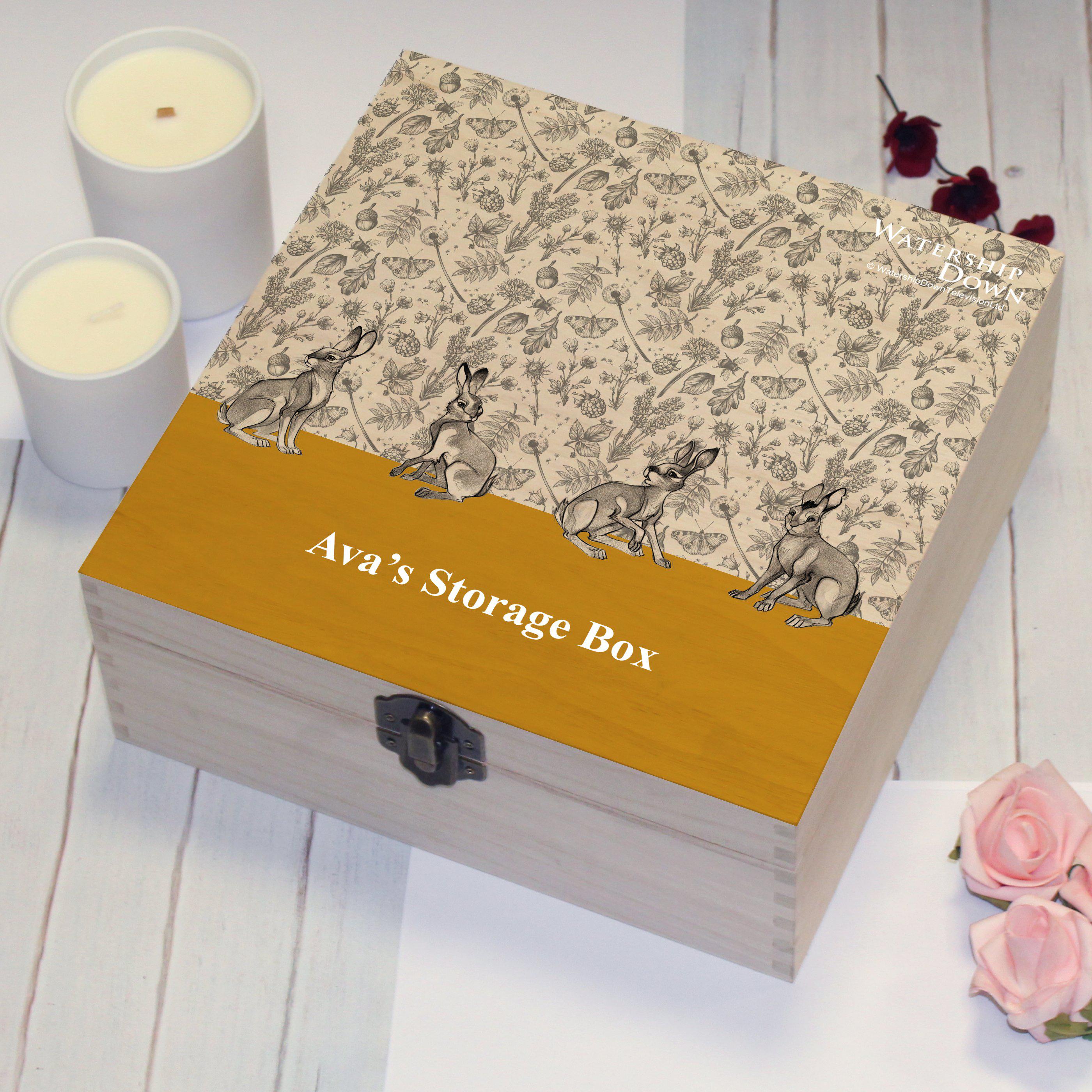 A stylish hinged wooden storage box from the classic Watership Down, personalise with a message of up to 40 characters.