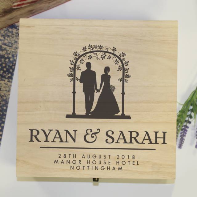 Wedding Memory Box - The Lid Pictures A Happy Couple Walking Through A Wedding Arch With The Couples Name And Wedding Details Below