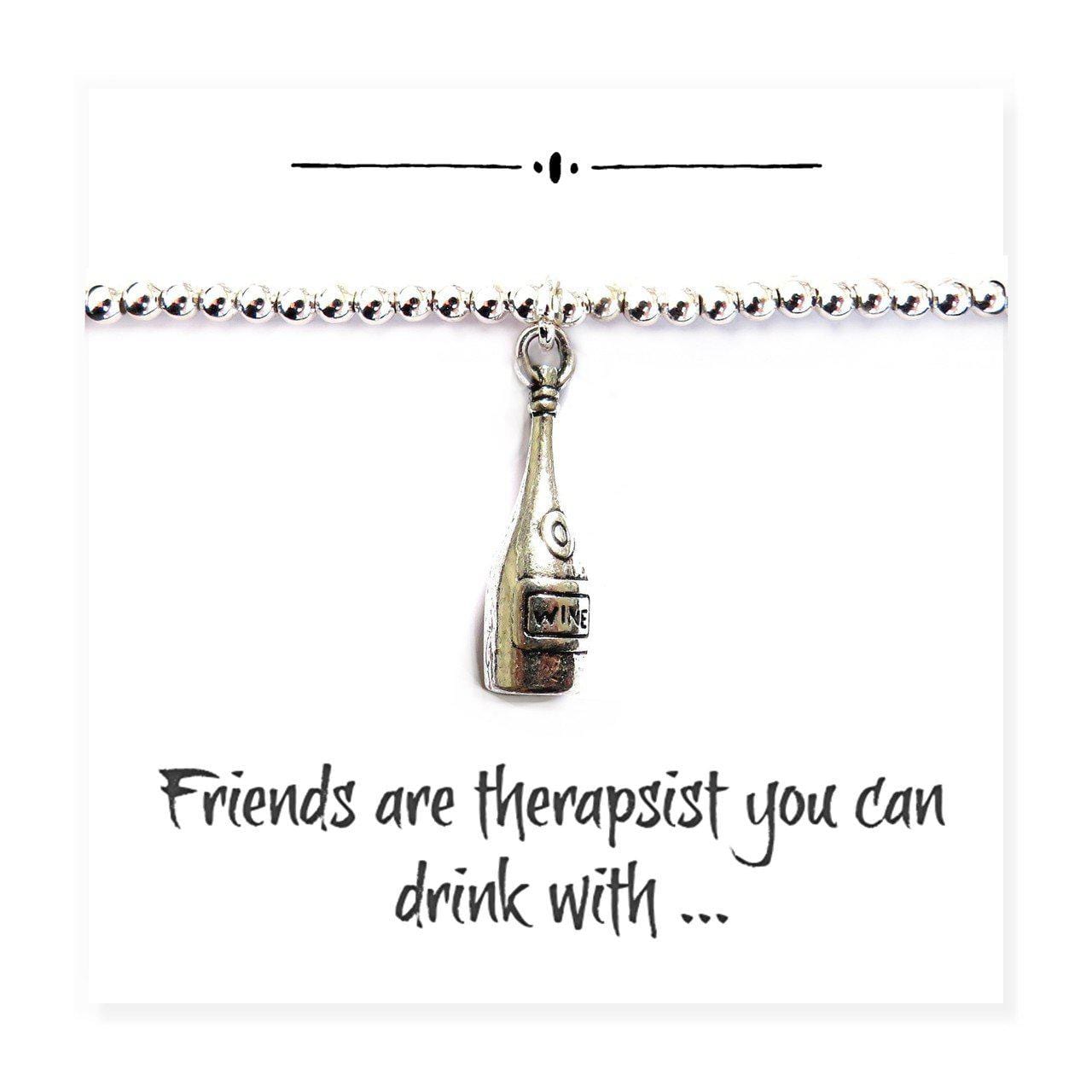A perfect bracelet for wine lovers, our small wine bottle charm bracelet is a fun gift to give to a really good friend, it is presented on a message card with a humorous message that says "Friends are therapists you can drink with", presented in a black gift box. So if you would like to say thank you to a friends for listening we are sure this little gift is sure to make her smile.